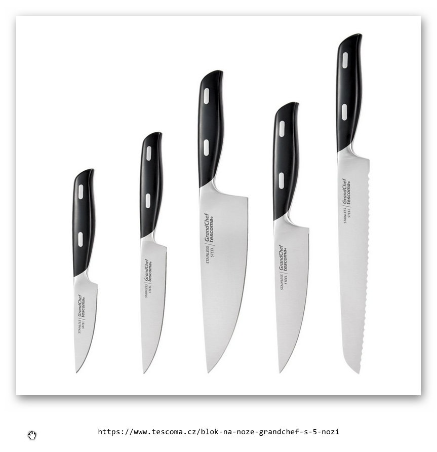 Pět špičkových nožů GrandCHEF v masivním dřevěném bloku. Spojení rukojetí a čepelí nožů GrandCHEF je hladké a plynulé. Jejich uchopení je pohodlné, krájení je rychlé a bezpečné. Vyrobeno kováním z prvotřídní nerezavějící nožířské oceli, blok z kvalitního dřeva gumovníku brazilského. 5 roků záruka.