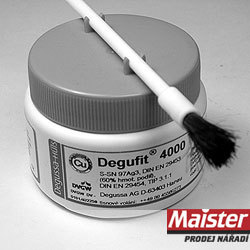 DEGUSSA DEGUFIT 4000 pájecí pasta 250g Sn97Ag3 TECHNICKÉ PARAMETRY: Tavný rozsah: 221 - 224 °C Hmotnost: 250 g Materiál: Sn97Ag3 - dle normy EN ISO 9453: 402 Vhodná pro pájení měděných trubek a fitinek z mědi, mosazi a bronzu společně s měkkou pájkou BrazeTec 4.