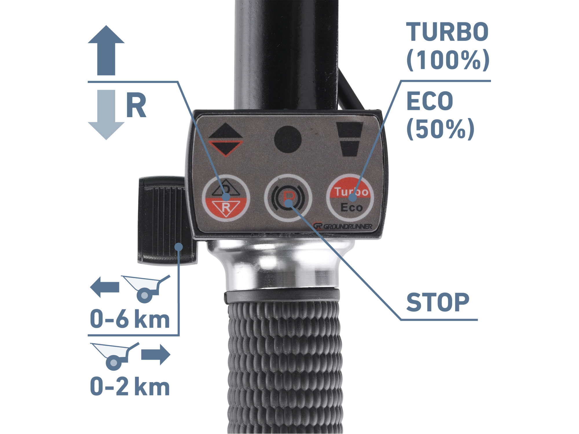 Na ovladači lze přepnout jízdu dopředu nebo dozadu, brzdu, normální rychlost nebo Turbo. Pro běžný provoz se používá normální rychlost, Turbo lze použít při jízdě do kopce, v obtížném terénu nebo při přepravě těžšího nákladu. Kolečko je poháněné nejmodernějším „brushless' motorem. Tento nový typ motoru má vyšší životnost, je výkonnější a má menší spotřebu el. energie než klasické motory s uhlíkovými kartáči. Zabudovaná převodovka s diferenciálem výrazně zlepšuje prostupnost terénem a výkon motoru při jízdě do kopce.