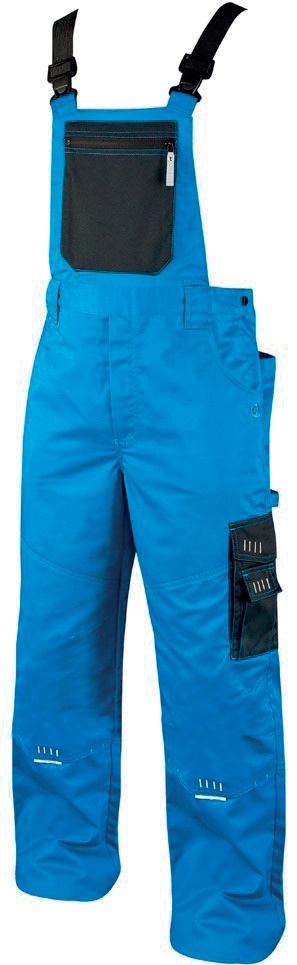 monterková kalhoty s laclem, zesílená kolena pro vkládání nákoleníků, v pase poutka na pásek, multifunkční boční kapsa na nářadí, na laclu kapsa na zip, elastické šle, reflexní doplňky, materiál 35%bavlna, 65% polyester, 240g/m2