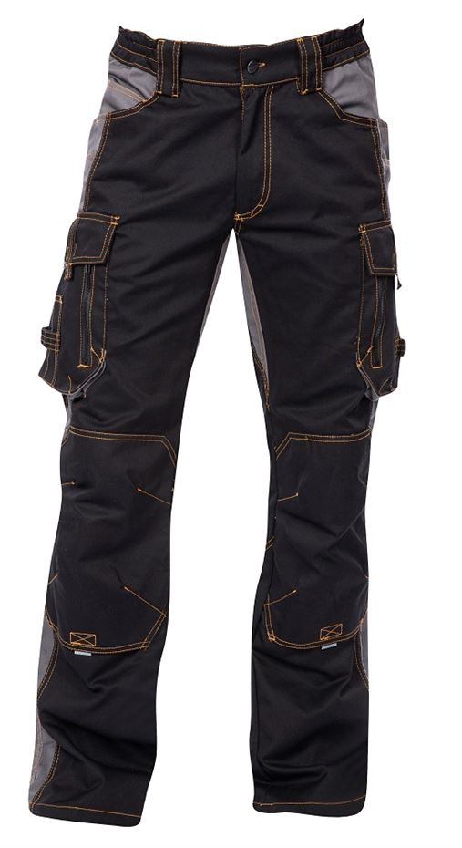 Monterkové kalhoty, zvýšený zadní díl pasu s pružnými vsadkami po stranách, vrstvené kapsy, zdvojená kolena pro vkládání výztuhy, materiál kepr 60%bavlna, 40% polyester, 260g/m2