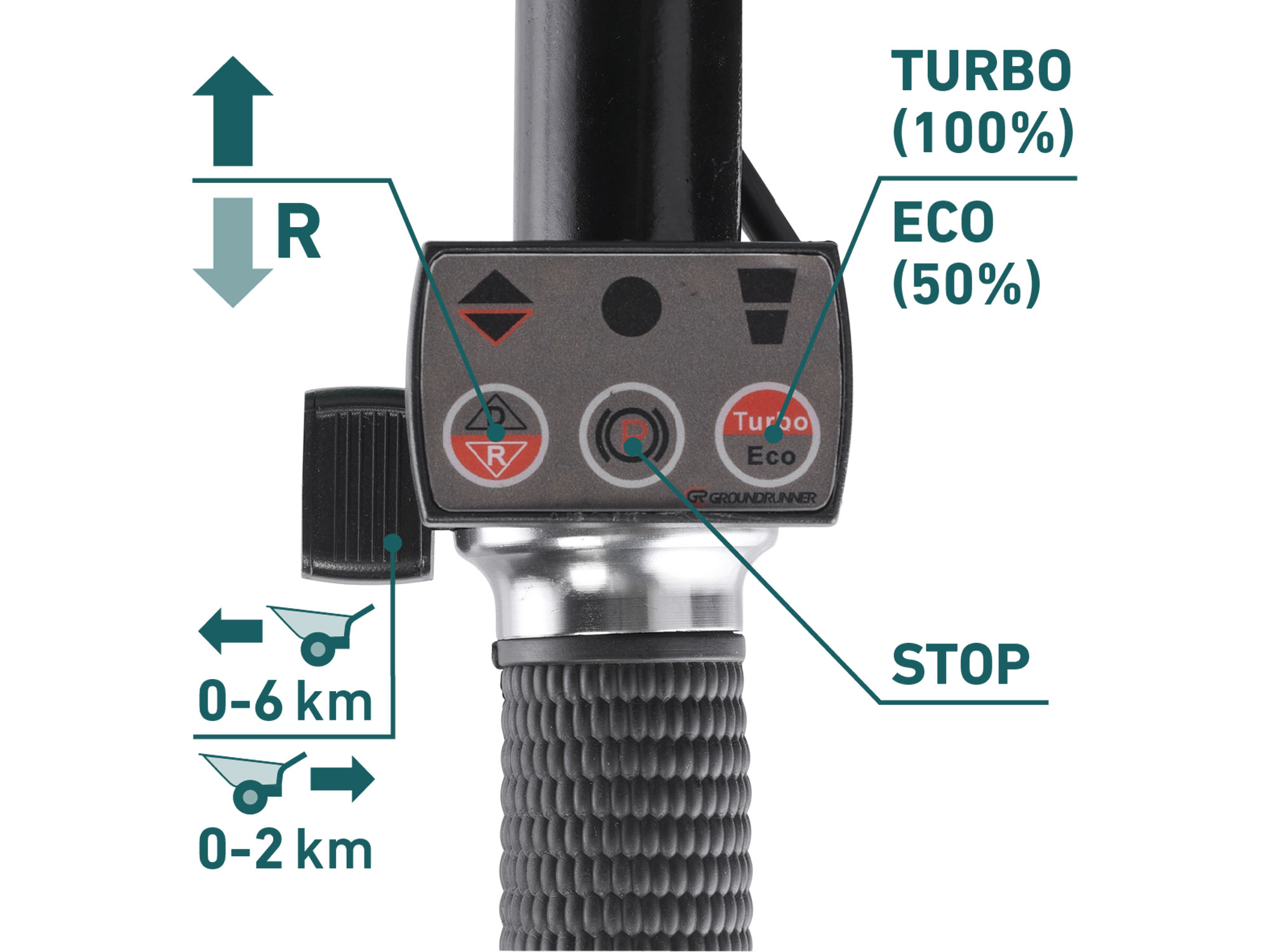 Pro běžný provoz se používá normální rychlost, Turbo lze použít při jízdě do kopce, v obtížném terénu nebo při přepravě těžšího nákladu. Kolečka jsou poháněná nejmodernějším „brushless" motorem. Tento nový typ motoru má vyšší životnost, je výkonnější a má menší spotřebu el. energie než klasické motory s uhlíkovými kartáči. Pokud je to nutné, lze krátkodobě používat kolečko bez baterie jen na ruční pohon. Zabudovaná převodovka s diferenciálem výrazně zlepšuje prostupnost terénem a výkon motoru při jízdě do kopce. Diferenciál umožňuje otočení koleček na místě. Díky umístnění těžiště nákladu nad osou kol je většina hmotnosti nákladu umístěna na kolech a obsluha skoro nic nenese.