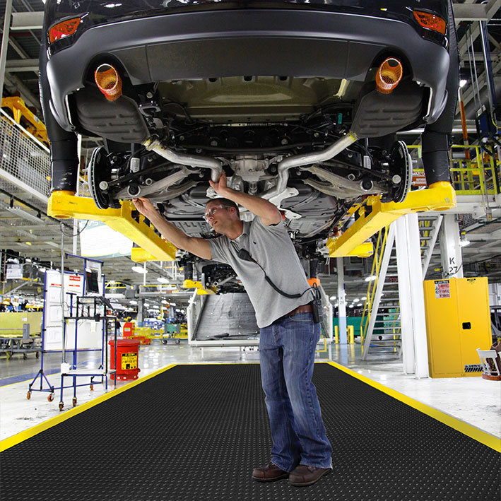Modulární protiskluzová protiúnavová průmyslová rohož De-Flex je tvořena čtvercovými modulovými rohožemi z odolné gumové směsi o rozměru 45 x 45 cm. Těmito moduly lze pokrýt rozlehlá pracoviště i individuální pracovní stanice. Vysokou ergonomii zajišťuje protiskluzný povrch s oblíbeným diamantovým vzorem a 19 mm silná, pružná konstrukce rohože, poskytující vysoký pracovní komfort v suchém průmyslovém prostředí.