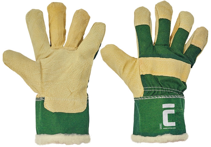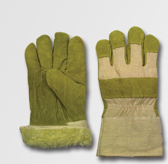 ochranné rukavice, dlaň ze žluté vepřové štípenky, hřbet z bavlněné tkaniny, podšívka z plyše, tuhá manžeta